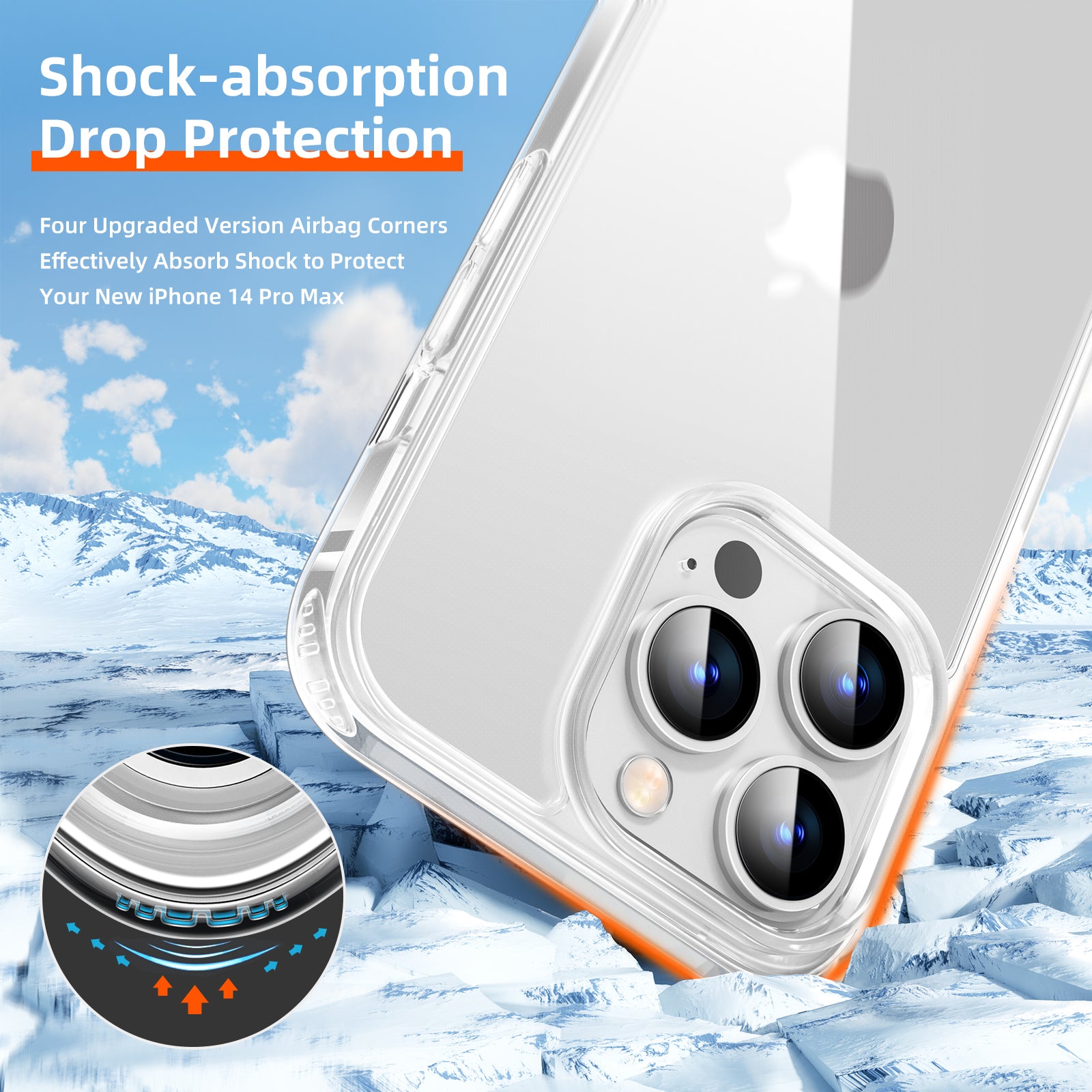 【Excellent Protection】Inner airbags design at the corners of the box can effectively reduce the driving force if it is accidentally dropped. Very practical compared to other external airbag edges and corners. Transparent The hard PC with micro dot pattern on the back of the iPhone 14 Pro Max case can effectively prevent scratches, fingerprints, oxidation and fading.